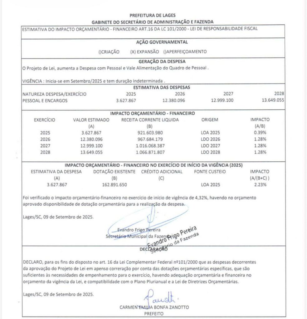 Em tramitação, o PLC 016/2025, quando vigorar, fará o governo Carmen Zanotto desembolsar cerca de R$ 13 milhões por ano com os novos cargos, totalizando quase R$ 40 milhões ate o fim do mandato, conforme estimativa de impacto financeiro assinada pelo secretário da Fazenda, Evandro Frigo. Trata-se de valores que poderiam ser utilizados de forma mais eficiente, com investimentos que de fato fariam diferença na vida do cidadão lageano.
