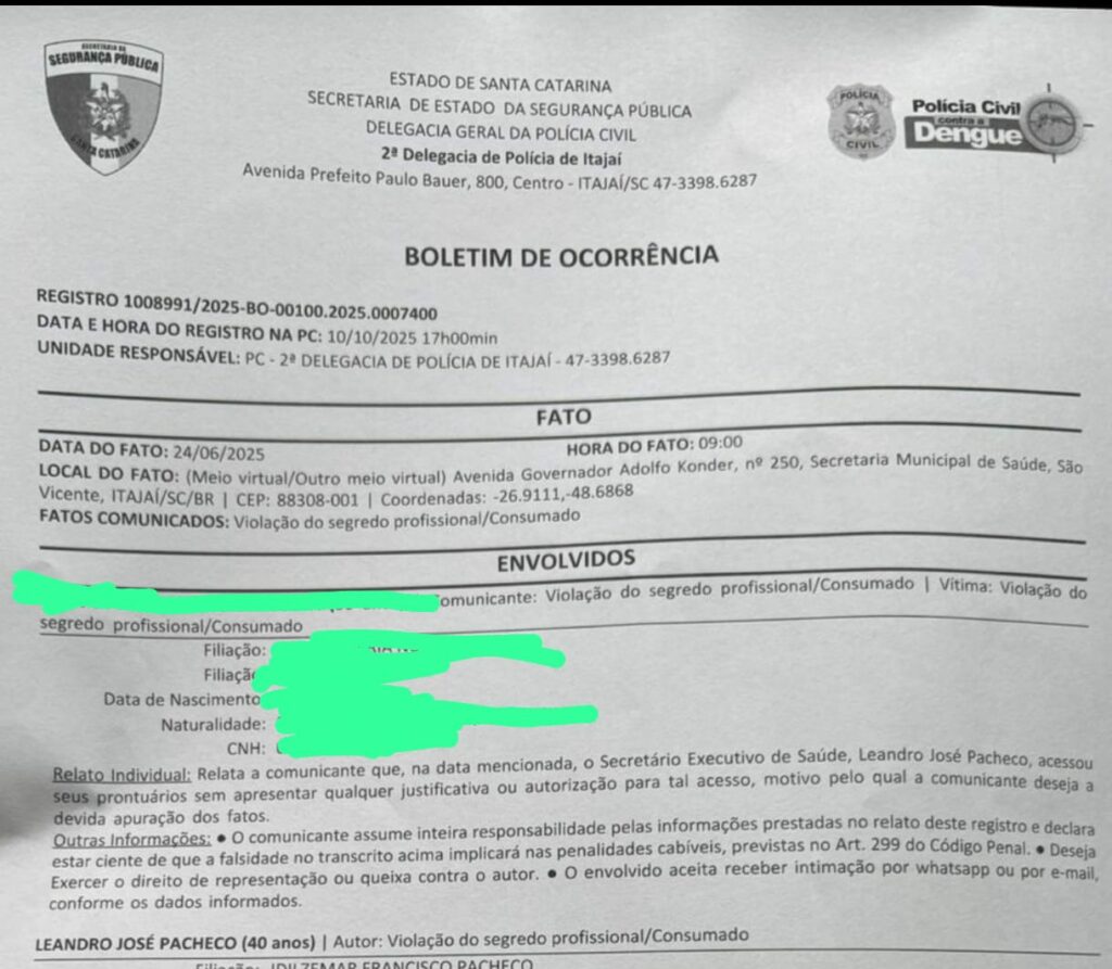 Um diretor da Secretaria de Saúde de Itajaí foi denunciado por ter, supostamente, acessado indevidamente prontuários médicos sigilosos de funcionários do setor. A informação foi divulgada pelo radialista Wilson Lima, da Band Notícias, e pelo colega Patrick Schneider, do Portal da Foz. Pelo menos três servidores teriam tido seus dados violados, sendo que um deles é portador do vírus HIV e teme que sua vida seja exposta. Para piorar, a ouvidoria teria arquivado a denúncia. A coluna apurou que o acusado pelos servidores é Leandro José Pacheco. O nome dele consta no boletim de ocorrência feito por uma das servidoras. Tentei contato com ele; ao saber do assunto, parou de responder às mensagens.