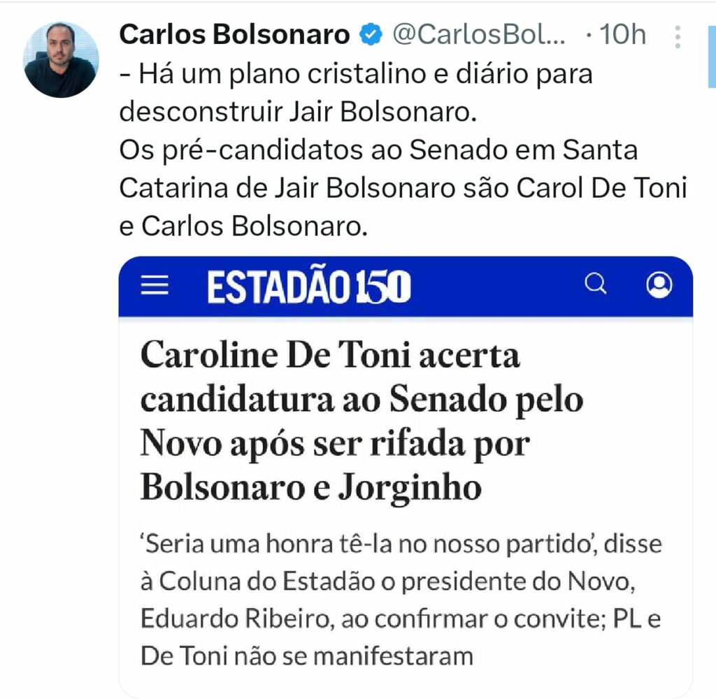 O vereador do Rio de Janeiro, Carlos Bolsonaro (PL), e o deputado federal Eduardo Bolsonaro (PL), ao rebaterem uma informação de que a deputada federal Carol de Toni (PL) se filiou ao Novo para disputar uma vaga ao Senado, afirmaram categoricamente que os candidatos ao Senado por Santa Catarina apoiados pelo ex-presidente Jair Bolsonaro (PL) são o próprio Carlos e Carol de Toni (PL). Vale informar que a informação não se confirmou e que, por enquanto, a parlamentar permanece no Partido Liberal. Resta saber se os filhos do ex-presidente vão para o enfrentamento também com o governador Jorginho Mello (PL), ao ponto de tentarem forçar uma chapa pura do PL ao Senado — o que é rechaçado pelo chefe do Executivo estadual. Quem terá mais força para decidir?