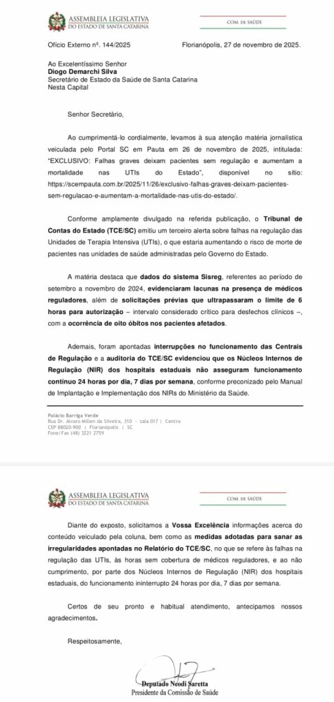 O deputado estadual Neodi Saretta (PT) entrou em contato ontem para informar que, na quinta-feira, após matéria publicada pelo SCemPauta sobre o relatório do Tribunal de Contas do Estado — que aponta para mortes e risco de morte de pacientes devido a atrasos no encaminhamento para UTIs em hospitais da rede estadual — enviou um pedido de explicações ao secretário de Estado da Saúde, Diogo Demarchi. “Assim que vi tua matéria na quinta-feira, imediatamente encaminhei pedido ao secretário da Saúde para saber das providências e explicações”, me disse Saretta. Ontem, publiquei um texto em que cobro da Comissão de Saúde da Alesc, presidida pelo parlamentar, a convocação de Demarchi para que explique as gravíssimas constatações do TCE.
