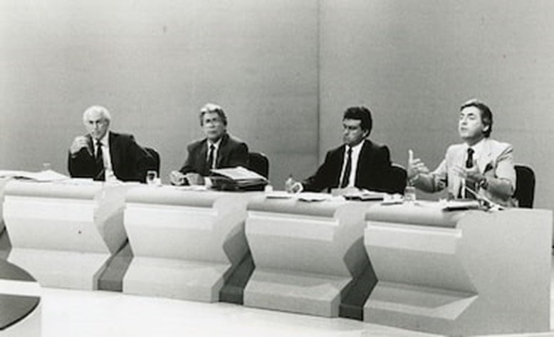Afif falando na mesa do debate, com Brizola, Covas e Caiado. Foto Paulo Cerciari/Estadão