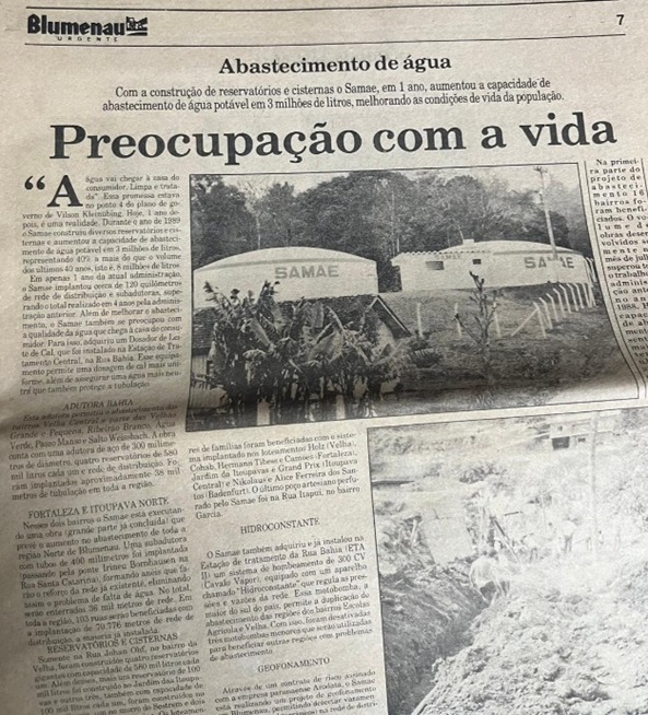 Lá no início desta série de relembranças da administração de Vilson Kleinubing na Prefeitura de Blumenau (1989-1990), mencionei um trio de prioridades imediatas que atiçavam o novo Prefeito. Uma delas dizia respeito ao fornecimento de água para os bairros que sofriam com o deficiente serviço do SAMAE. Esta precedência teve, já no primeiro ano do Prefeito, solução muito bem encaminhada, graças ao seu dedicado empenho e ao competente e incansável trabalho de Carlos Wachholz na presidência da autarquia municipal.