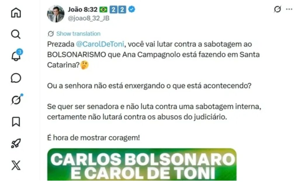 A deputada federal Carol de Toni (PL) começou a ser alvo do gabinete do ódio, supostamente ligado a Carlos Bolsonaro (PL). Segundo uma fonte, a leitura do grupo ligado ao ex-vereador do Rio de Janeiro é que era preciso focar na deputada catarinense para tentar desidratá-la. Claro, sem aparecerem as digitais de Carlos, que pretende manter as aparências. Resta saber se há espaço para um recuo, a partir da constatação de que os ataques a Carol partiram do tal gabinete. O que é dito por algumas fontes de dentro do PL é que o método é o mesmo, por isso teria sido fácil identificar a suposta origem dos ataques.