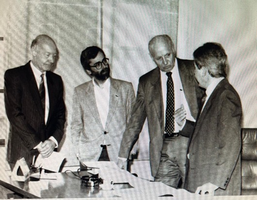 Da esquerda para a direita: Cônsul da Alemanha em Blumenau Hans Prayon; Secretário de Planejamento Paulo Gouvêa; Embaixador da Alemanha no Brasil Heinz Ditman; Prefeito Vilson Kleinubing. Foto: Arquivo Público de Blumenau.
